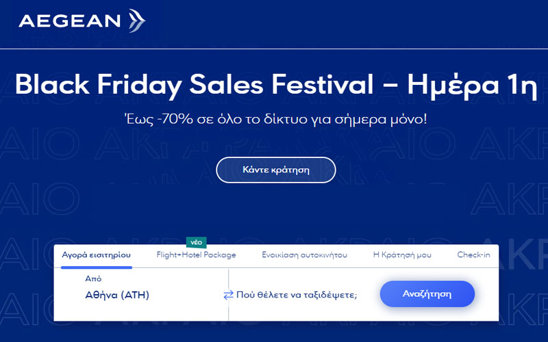 Η σημερινή Παρασκευή, Black Friday, δεν μοιάζει με καμία άλλη! Έκπτωση έως 70% σε όλες τις πτήσεις από την Aegean. Ναι, καλά διαβάσατε, σε όλες τις πτήσεις. Ψυχραιμία, προλαβαίνετε ακόμη να κλείσετε όλα τα επόμενα ταξίδια σας.