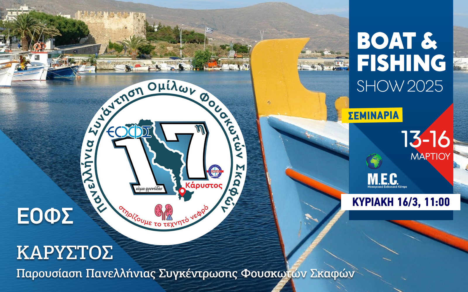 Την Κυριακή 16 Μαρτίου 2025, στις 11:00 π.μ., στην αίθουσα σεμιναρίων της Boat & Fishing Show 2025, θα πραγματοποιηθεί ειδική παρουσίαση της 17ης Πανελλήνιας Συνάντησης Ομίλων Φουσκωτών Σκαφών. Μην τη χάσετε!