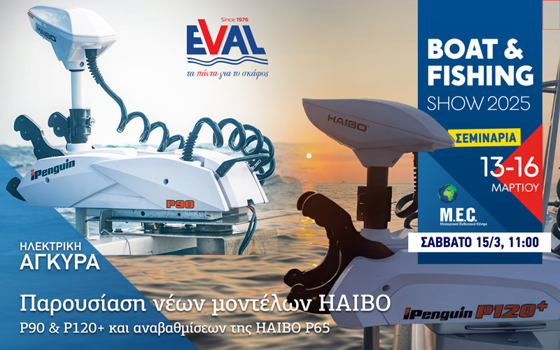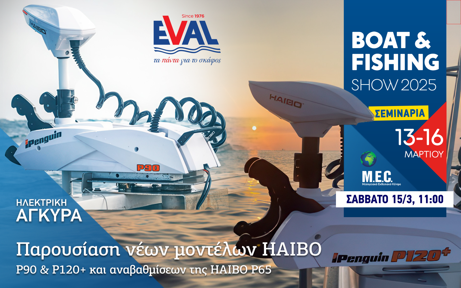 Το Σάββατο 15 Μαρτίου 2025 και ώρα 11:00, στην αίθουσα σεμιναρίων της Boat & Fishing Show 2025, θα πραγματοποιηθεί η επίσημη παρουσίαση των νέων μοντέλων ηλεκτρικών αγκυρών HAIBO P90 & P120+.