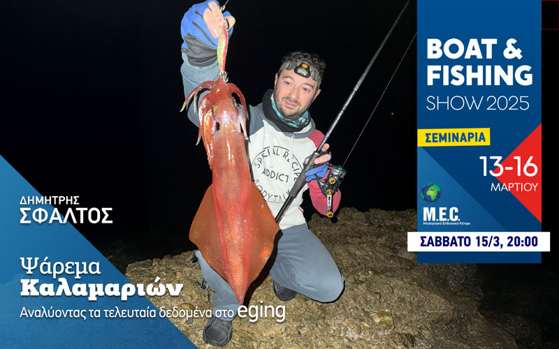 Το Σάββατο 15 Μαρτίου 2025, στις 20:00, στην αίθουσα σεμιναρίων της Boat & Fishing Show 2025, ο Δημήτρης Σφαλτός θα παρουσιάσει τις πιο σύγχρονες εξελίξεις και τα μυστικά του ψαρέματος καλαμαριών με την τεχνική του eging.