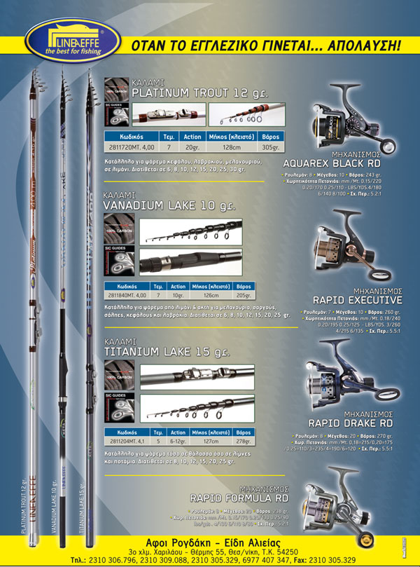 Οι Αφοί Ρογδάκη θα μας παρουσιάσουν μια πλήρη γκάμα από προϊόντα αλιείας που καλύπτουν όλες τις τεχνικές ψαρέματος τόσο από σκάφος όσο και από ακτή. Προϊόντα των οίκων που αντιπροσωπεύει αποκλειστικά στην χώρα μας, όπως της LINEAEFFE SPA και του TUBERTINI HIGH QUALITY.