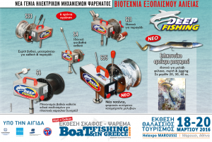 Ο Σπύρος Πατσής, κατασκευαστής των ηλεκτρικών μηχανισμών Deep Fishing, παρουσιάζει αποκλειστικά και μόνο στην Boat & Fishing Show – Έκθεση Ψάρεμα Σκάφος όλη τη γκάμα μηχανισμών για συρτή βυθού, βαθιές καθετές, παραγάδι κλπ καθώς και τους μηχανισμούς AVET, κατασκευασμένους στην Αμερική, αλλά και πλούσια γκάμα εξοπλισμού.