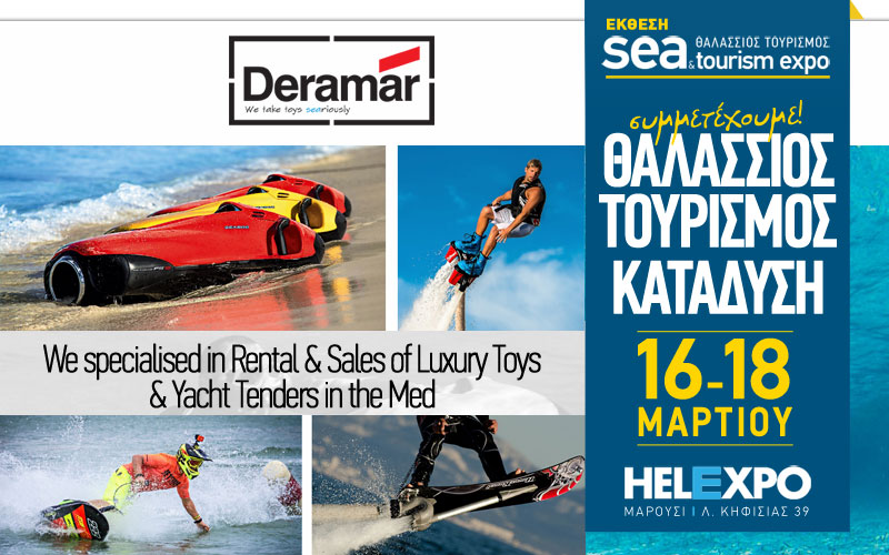 Έχoντας στη γκάμα της, ότι πιο καινούργιο υπάρχει στην αγορά των watersports, θαλασσίων παιχνιδιών και σκαφών ή DERAMAR αναπτύσσεται ταχέως στο κομμάτι του θαλάσσιου τουρισμού. Η Deramar, είναι αποκλειστικός αντιπρόσωπος πολλών εταιρειών στο χώρο, τα οποία διαθέτει και προς ενοικίαση. Όλοι οι λάτρεις των θαλάσσιων σπορ, θα έχουν την ευκαιρία να ενημερωθούν για όλες τις τελευταίες εξελίξεις στο χώρο. Μπορούν να δουν από κοντά, τα τελευταία μοντέλα που θα κατακλύσουν τις θάλασσες το καλοκαίρι.