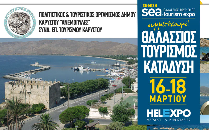 Ο Δήμος Καρύστου, ο Πολιτιστικός & Τουριστικός Οργανισμός Δήμου Καρύστου “ΑΝΕΜΟΠΥΛΕΣ” και ο Σύνδεσμος Επιχειρήσεων Τουρισμού Καρύστου θα συμμετάσχουν για ακόμα μία φορά και θα δώσουν δυναμικό παρόν στη Sea & Tourism Expo 2018 που πραγματοποιείται ταυτόχρονα με την Boat & Fishing Show 2018 – Έκθεση Ψάρεμα Σκάφος.