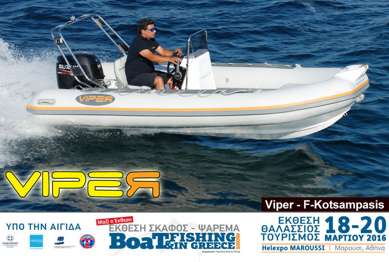 Η F-Kotsampasis κατασκευάζει αεροθαλάμους για αρκετές ελληνικές εταιρίες φουσκωτών. Στην Boat & Fishing Show 2016 Έκθεση Ψάρεμα Σκάφος θα παρουσιάσει την μεγάλη γκάμα φουσκωτών Viper, σκάφη που ξεκινούν από τα 2.40 ως τα 9,70 μέτρα, με απεριόριστες δυνατότητες για custom κατασκευές.