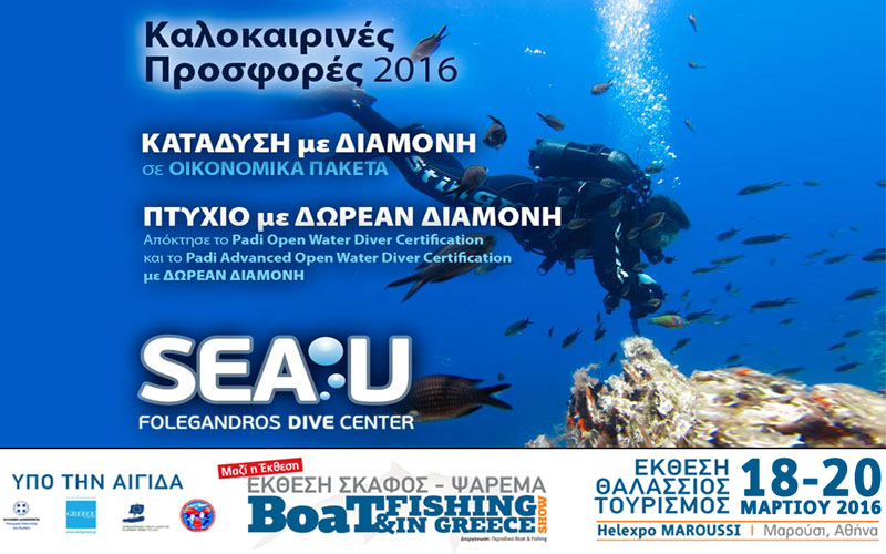 Το καταδυτικό κέντρο SΕΑ U στην έκθεση Θαλάσσιος Τουρισμός – Sea & Tourism Expo 2016! To Sea U βρίσκεται στο νησί της Φολεγάνδρου. Θα παρουσιάσει τις νέες καλοκαιρινές προσφορές, πακέτα Κατάδυσης με Διαμονή σε οικονομικά πακέτα, ακόμα και πτυχίο με Δωρεάν Διανομή!