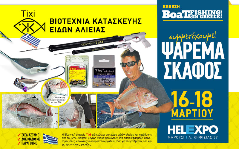 Η εταιρεία TIXI του Αλέξανδρου Τσιρώνη παρουσιάζει στην Boat&fishing show 2018 τη µεγάλη ποικιλία ψαρευτικού εξοπλισµού ελληνικής κατασκευής που διαθέτει. Στα προϊόντα της θα βρούμε ανθεκτικές πρωτότυπες απόχες, κιούρτους σε διάφορα σχήματα, καµάκια και διάφορα είδη ψαρευτικού εξοπλισμού.