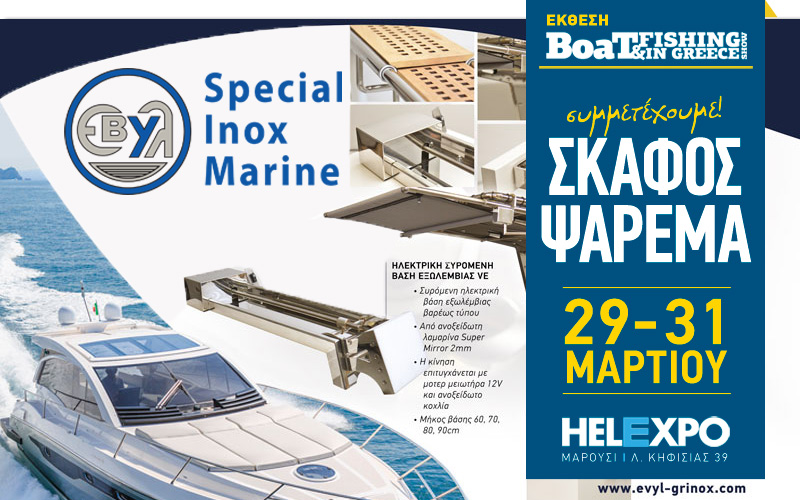 Η EVYL SA, θα παρουσιάσει την μεγάλη γκάμα ανοξείδωτων ναυτιλιακών κατασκευών, όπως την πατενταρισμένη Συρόμενη Βάση Αισθητήρα Βυθομέτρου, την Ηλεκτρική Βάση Εξωλέµβιας EVYL VE, Ηλεκτροκίνητη συρόμενη τέντα σκάφους ST, ρολ μπάρ και άλλες κατασκευές.