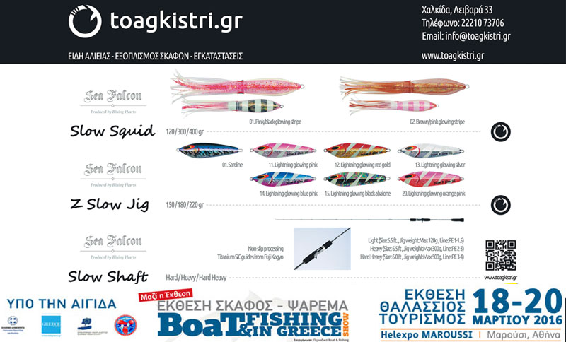 Θα παρουσιάσει σε όλη την ελληνική αγορά μια ολοκληρωμένη γκάμα προϊόντων για Slow Jigging της Sea Falcon καθώς και νέα προϊόντα των Ιαπωνικών εταιριών Xesta, PALMS, HOTS, HALCYON, CRAZY OCEAN.