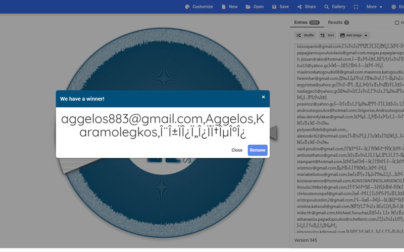 Ο τυχερός νικητής που ανέδειξε το wheelofnames ανάμεσα σε 2.435 εγγραφές email είναι ο Aggelos Karamolegkos, aggelos883[@]gmail.com από Σαντορίνη!