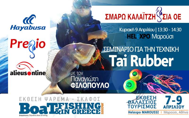 H εταιρεία Σμαρώ Καλαϊτζή & ΣΙΑ ΟΕ, αντιπρόσωπος των εταιρειών Pregio, Hayabusa, Balzer, Omoto, Rapala, Strike Pro, Williamson κλπ. διοργανώνει μαζί με τον Παναγιώτη Φιλόπουλο, ιδιοκτήτη του καταστήματος AlieusOnline και του ηλεκτρονικού καταστήματος www.alieus.gr, ένα σεμινάριο με στόχο να αναλυθούν όλες οι πτυχές της νέας τεχνικής, Tai Rubber.